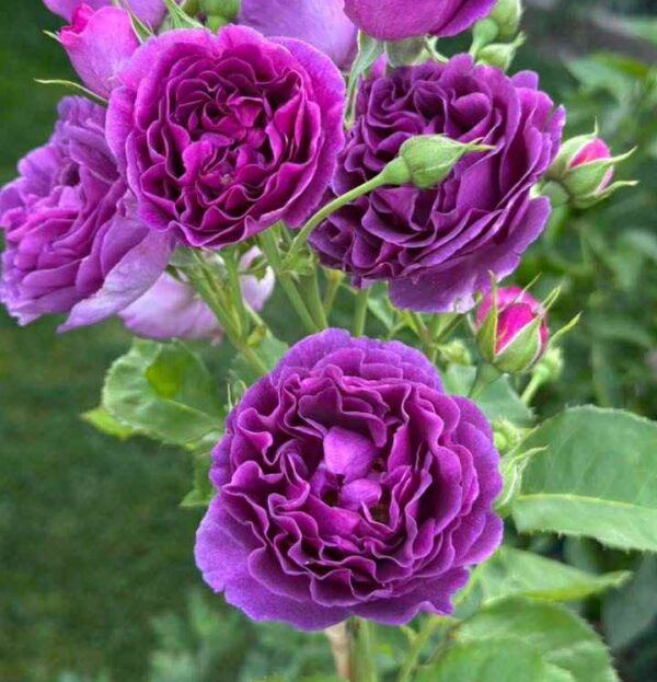 Sally is a wonderfully fragrant floribunda rose. It produces clusters of stunning deep purple English style blooms on a compact framework. Compact vigorous grower with glossy green foliage which boasts excellent resistance to disease through the year. Blooms in early summer and will repeat through until the first autumnal frosts